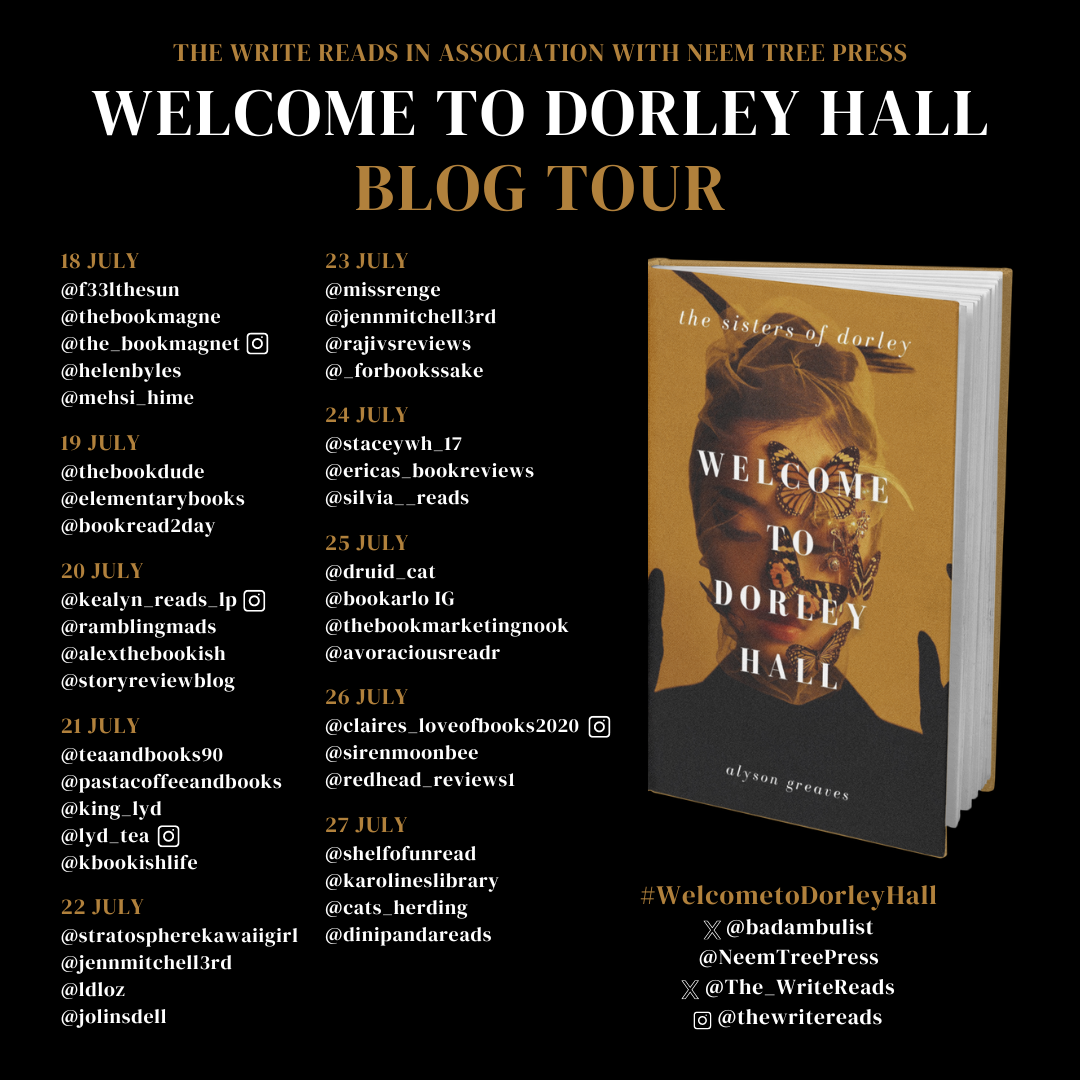 Today is my stop on the blog tour for Welcome To Dorley Hall by Alyson Greaves. I am excited to be sharing a spotlight with you all, so that you can learn a little about the book!